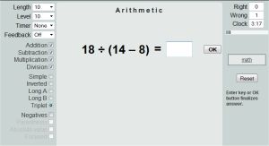 The activities are arranged into three groups: The first one is suitable for grade 4 students who practice only the four operations of addition, subtraction, multiplication & division. The second group contains also parentheses practice, and the last group includes also exponents practice, which is suitable for students of higher grades.